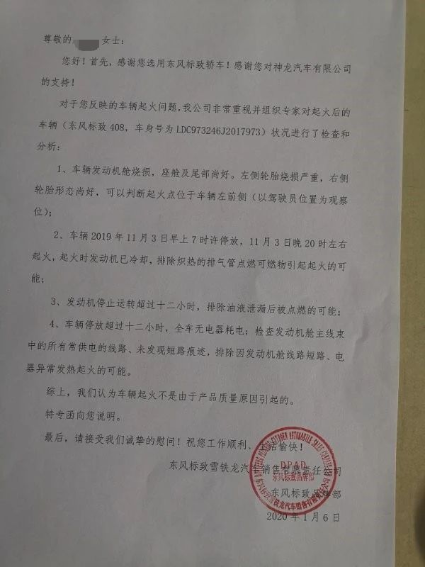 9月22日,房女士购车所在的东风标致官方4S店负责人向《消费者报道》表示,厂家技术人员提供的鉴定结果显示火灾并非汽车质量问题所致,建议车主通过法律途径维权,而第三方司法鉴定机构则认为汽车起火是蓄电池故障所致。为了解汽车起火原因和相关赔偿措施,《消费者报道》向神龙汽车有限公司、东风标致雪铁龙汽车销售有限责任公司发送了采访函,截至发稿前未获回复。