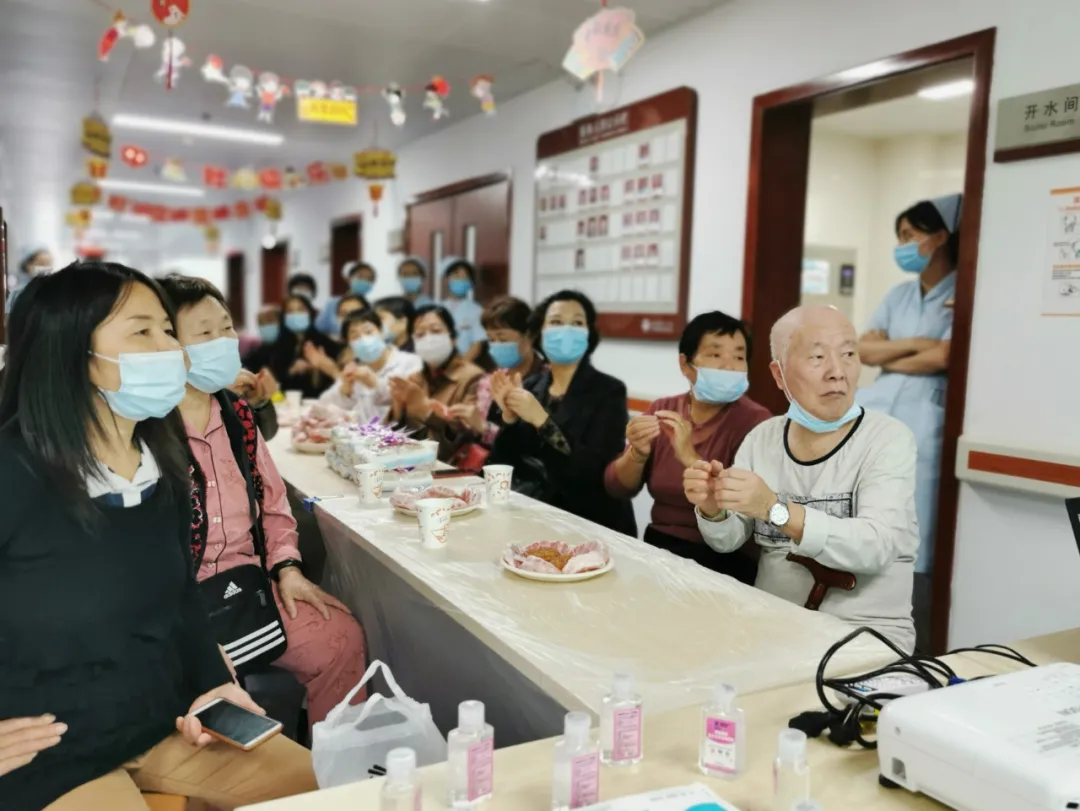 在病房举办联欢会时,大内科医护人员提前精心布置病区环境,营造良好的节日氛围。活动现场,援鄂英雄吕红梅利用PPT为大家解读新冠肺炎疫情的防控措施、正确佩戴口罩的方法,并带领患者及家属做“洗手操”等。医护人员还向患者赠送了由健脾润肺养生粥等养生小礼品组成的伴手礼,祝患者早日康复。