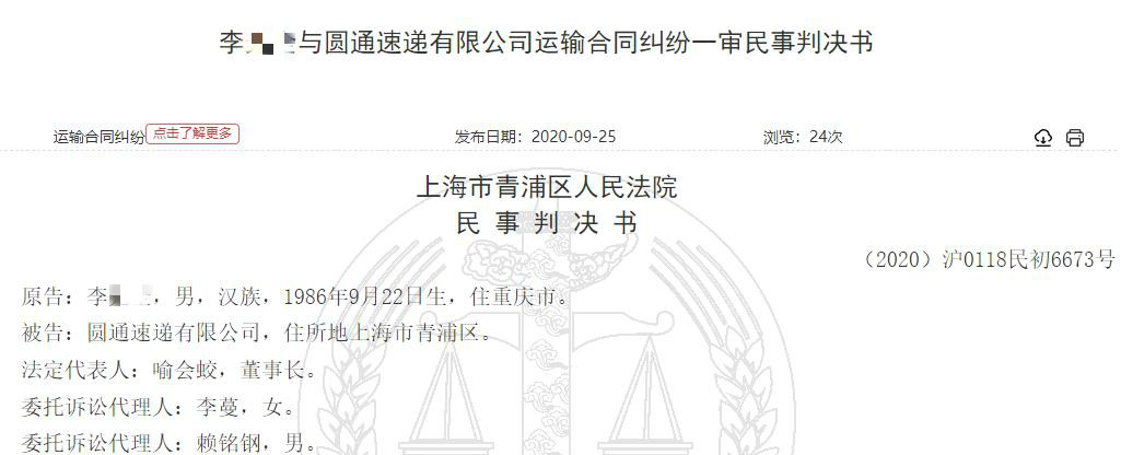 上海市青浦区人民法院民事判决书((2020)沪0118民初6673号)显示,原告李某全与被告圆通速递有限公司运输合同纠纷一案,法院于2020年4月17日立案后,依法适用简易程序。本案现已审理终结。