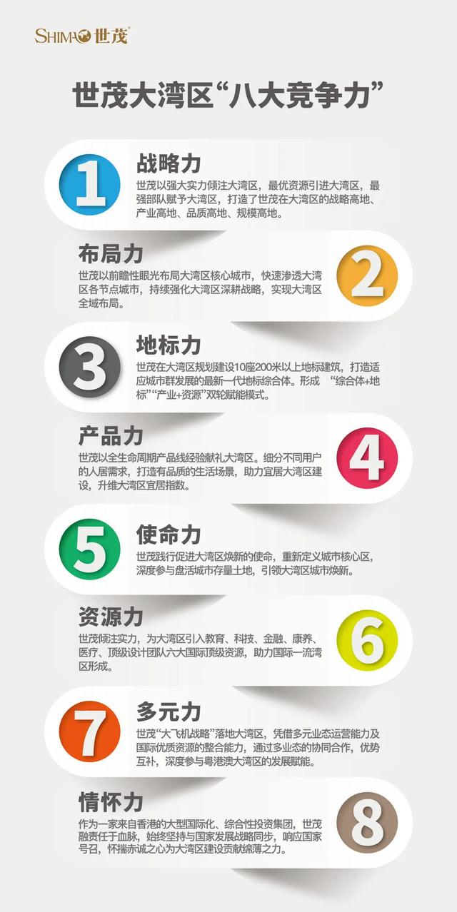 世茂前瞻性战略引领,战略布局粤港澳大湾区,成为湾区行业引领者。实力倾注中凝聚着世茂大湾区战略力、布局力、地标力、产品力、使命力、多元力、资源力、情怀力八大竞争力。持续深耕赋能中国大湾区,助推世界一流湾区建设发展,世茂将跟随国家战略与湾区人民一起拥抱未来,走向世界。
