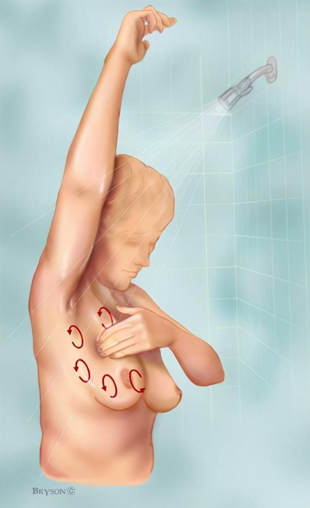 第五步:站立或坐下,使用第四步的方法再次触摸乳房。此外站立时,伸直右手指在左腋下,用指尖检查是否有淋巴结,同样方法检查右腋下。