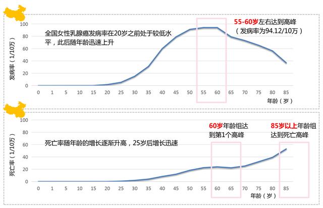 我国女性于55-60岁左右达到乳腺癌发病高峰。