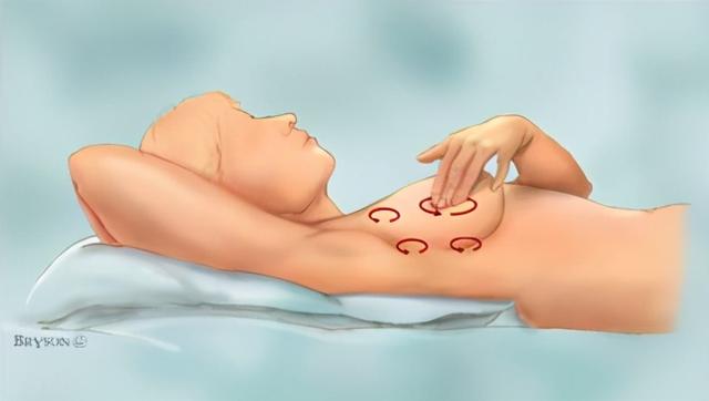 第四步:躺下,触摸乳房,感知有无肿块、疼痛、分泌物等异常。先用右手触摸左乳房,然后用左手触摸右乳房。触摸时几个手指并拢,平整伸直,平稳地触摸乳房,手指慢慢在乳房上转小圈检查。可以从乳头开始,逐渐转圈移动,一直检查到乳房的外缘;也可上下或者左右移动,总之要对整个乳房都进行检查,不能漏掉任何一个地方。