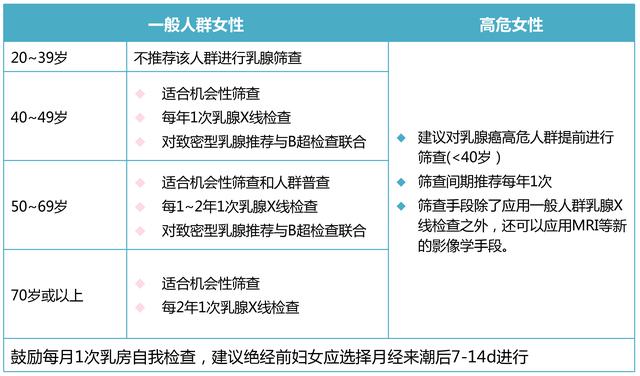 鼓励每月1次乳房自我检查,绝经前妇女选择月经来潮后7-14d进行。
