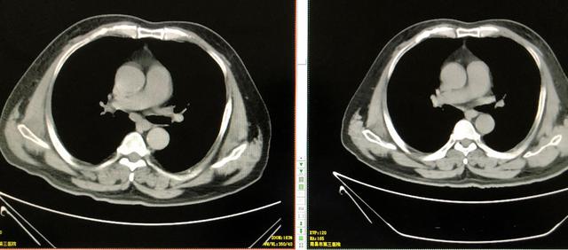 放疗结束后复查胸部CT提示肺部原发灶及纵膈转移淋巴结明显消退,放疗效果明显。