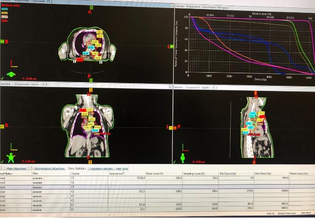 放疗科医生为患者进行了细致地查体,认真阅片会诊后,与病人及家属沟通交代病情,得到病人及家属的签字同意后,决定给予患者化疗联合适形调强放疗(IMRT)。经过放疗科团队精确定位、精确计划、精确治疗之后,患者在放疗过程中仅出现轻度的食管粘膜反应及I度骨髓抑制。