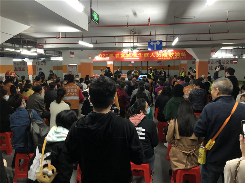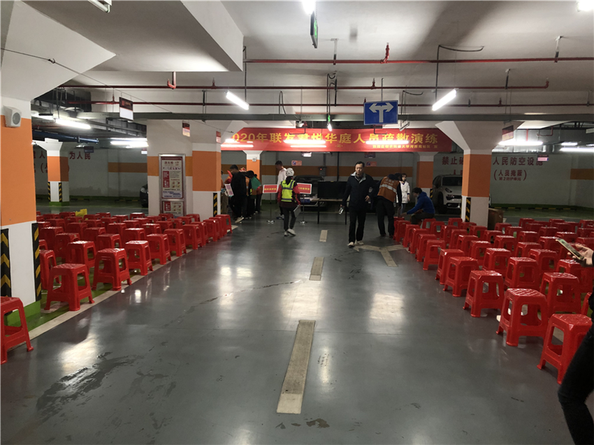 “慢一点,请注意脚下”,在人防通道楼梯下,疏散引导组提醒着。在疏散引导员的带领下,四面八方涌来的居民小组快速有序地跑向指定的防控掩蔽区域——地下停车场。