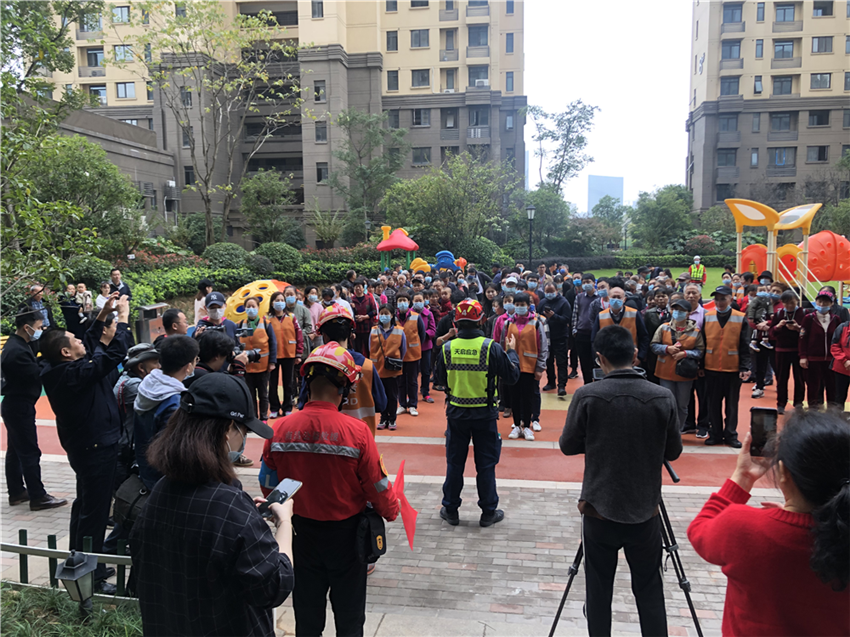 10时15分,随着一阵阵低沉的“呜呜……”之声响彻上空,防控警报拉响了,伴着现场烟雾缭绕,170余位居民按照预案开始紧急“撤离”。
