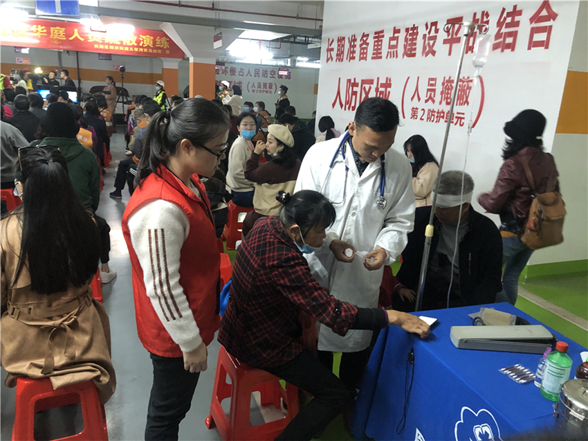 进入地下停车场后,居民们整齐有序坐在椅子上,等待着警报声解除的同时,后勤保障组向居民发放了救援物资。在旁的救援医疗小组医生们严正以待,以便突发应急救护。11时连续鸣叫的解除警报声响起,居民们从地下停车场走了出来。