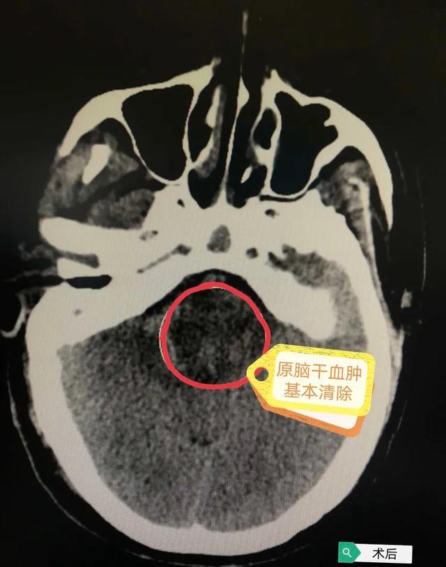 术后复查头颅CT提示脑干血肿基本清除,脑室引流管在位,脑积水情况明显缓解,颅压监护装置提示颅内压值为9mmHg(正常值为8-20mmHg),手术成功。返回病房进一步对症治疗,密切观察神志、瞳孔、生命体征情况、脑室及硬膜外引流管引流的性质、量及颜色情况。