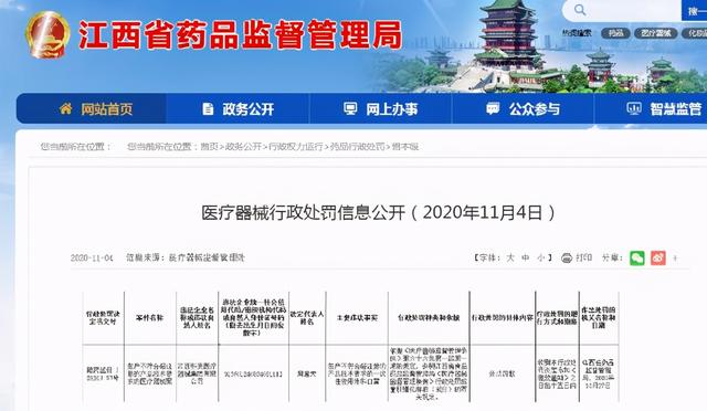 中国网财经11月4日讯 今日,江西省药监局发布行政处罚信息,江西科美医疗器械集团有限公司(“江西科美医疗器械集团”)因生产不符合经注册的产品技术要求的一次性使用外科口罩,被处以罚款。