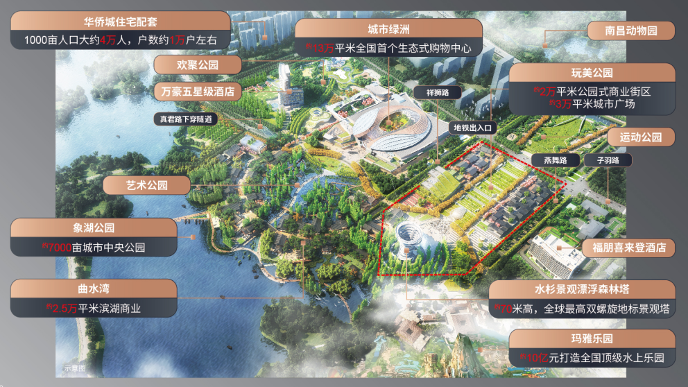 整个华侨城欢乐象湖项目计划投资220亿元打造象湖西岸公园式城市级文旅商业综合体,将构建“一大中心”、“三方天地”。北侧为玛雅乐园,南侧为曲水湾商业街,西侧为玩美公园,西南侧为城市绿洲购物中心、欢聚公园、万豪酒店等。从地标到乐园再到商业、酒店,这里可以说是全南昌业态最全、等级最高、可玩性最高的区域。