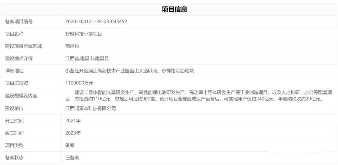 根据公示信息显示,智能科技小镇建设地址位于江西省南昌市南昌县小蓝经开区滨江高新技术产业园富山大道以南、东祥路以西地块;建设单位为江西鸿富杰科技有限公司,计开工时间为2021年,竣工时间为2023年 。
