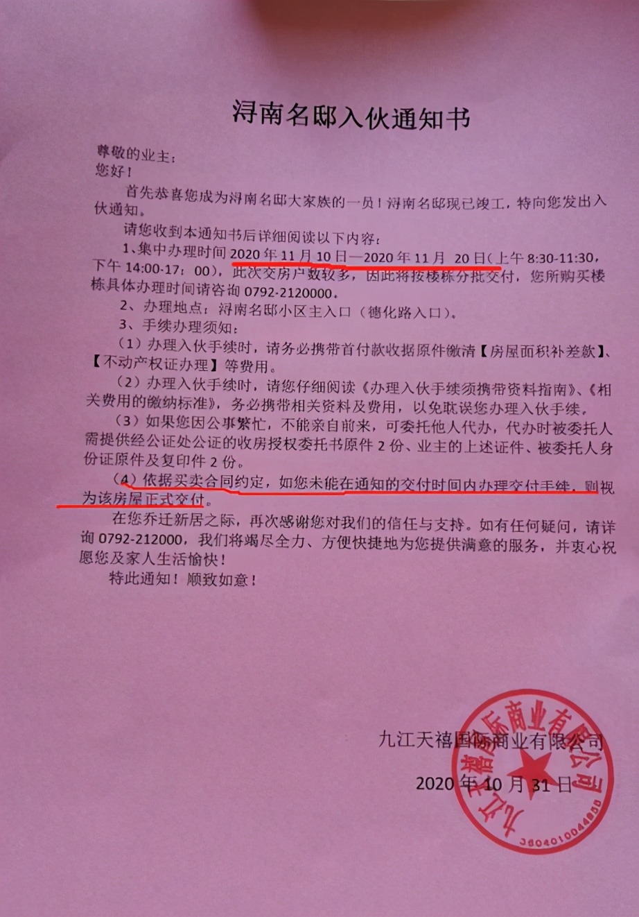 记者了解到,公寓业主都收到了开发商九江天禧国际商业公司的入伙通知单。上面明确写有浔南名邸现已竣工交付,集中办理时间为2020年11月10日至2020年11月20日;依据买卖合同约定,如未能在通知的交付时间内办理交付手续,则视为该房屋正式交付。