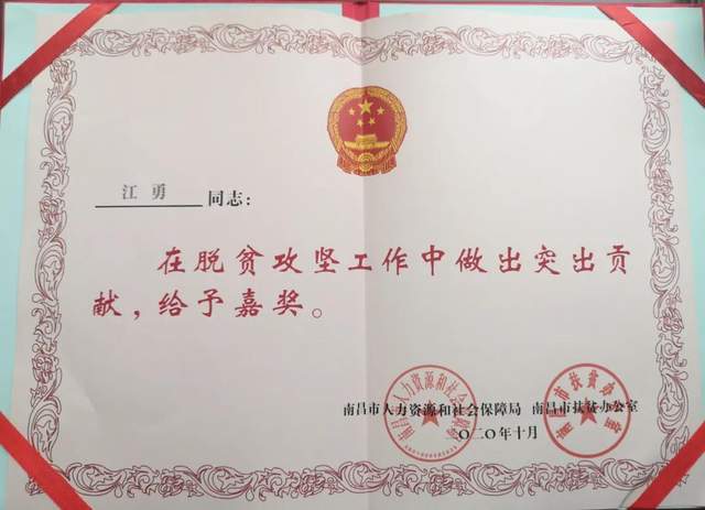 近日,南昌市第三医院院派驻的进贤县白圩乡金山村驻村第一书记江勇同志,在扶贫攻坚工作中做出突出贡献,被南昌市人力资源保障局、南昌市扶贫办评为先进个人,给予嘉奖。