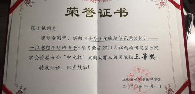 张小艳同志在2020年10月23日-25日举办江西省研究型医院检验分会学术年会获“中元杯”案例大赛三级医院组三等奖。