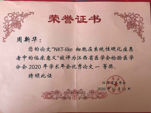 近日,南昌市第三医院检验科人员连获多项荣誉。周新华同志在2020年11月13-15日举办江西省医学会检验医学分会2020年学术年会获优秀论文一等奖。