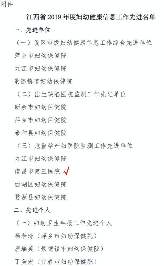 2020年11月23日,南昌市第三医院被江西省卫生健康委评为2019年度江西省危重孕产妇医院监测工作先进单位,这是继三院去年获得此项荣誉后再次蝉联。这既是上级主管部门对三院危重孕产妇救治能力的认可,更是三院今后发展的动力,三院将以此为起点,切实履行区域内危重产妇救治任务,加强救治体系建设,提高救治业务能力,为广大妇女儿童健康提供更优质的服务。
