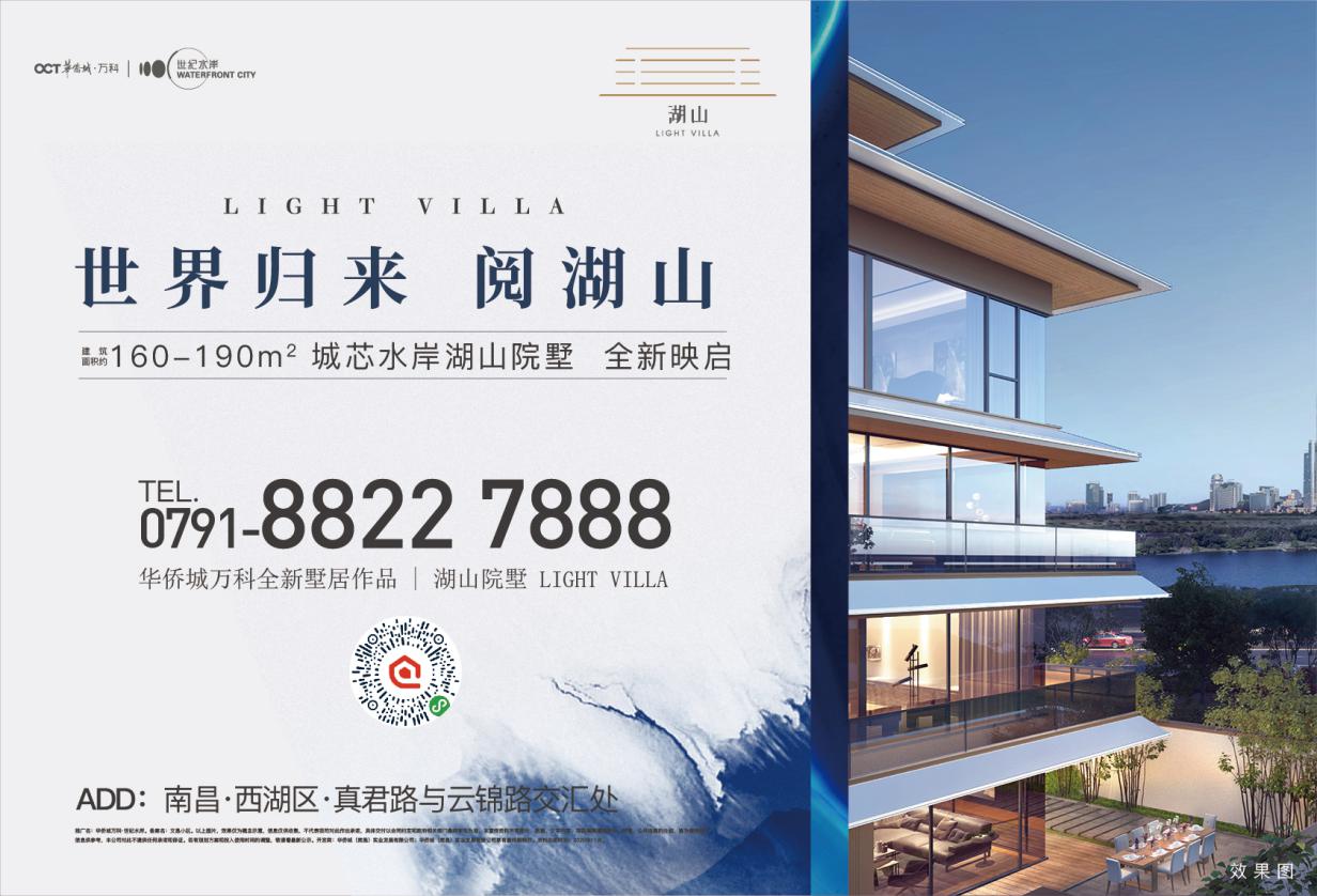 推广名:华侨城万科·世纪水岸。备案名:文昌小区。以上图片,效果仅为概念示意,信息仅供收集,不代表我司对此作出承诺,具体交付以合同约定和政府相关部门最终审批为准。本宣传资料所有图片、数据、文字内容、项目周围道路规划、环境、公共设施的介绍,皆为提供相关信息供参考,本公司对此不提供任何承诺和保证。湖山院墅,即将启幕;开发商:华侨城(南昌)实业发展有限公司;华侨城(南昌)实业发展有限公司享有最终解释权。资料出街时间:2020年11月。