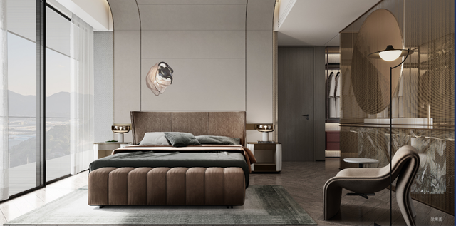 卧室设计中,湖山保证了主卧的尺度感,独立衣帽间和星级卫浴空间让主卧套拥有酒店化的居住体验,而次卧的尺度也足够让二孩家庭满足小孩房的需求;