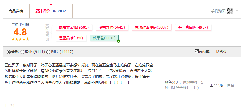 在天猫多燕瘦旗舰店内,销量最高的产品是“SoSo棒蓝莓味酵素果冻”。但在36.3万条累计评价下,我们发现了4191条差评(差评率约为1.15%)。