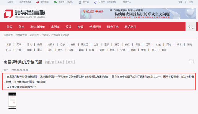 为此,气愤的业主,实在是没有办法,一纸诉状投到人民网的领导留言板上。