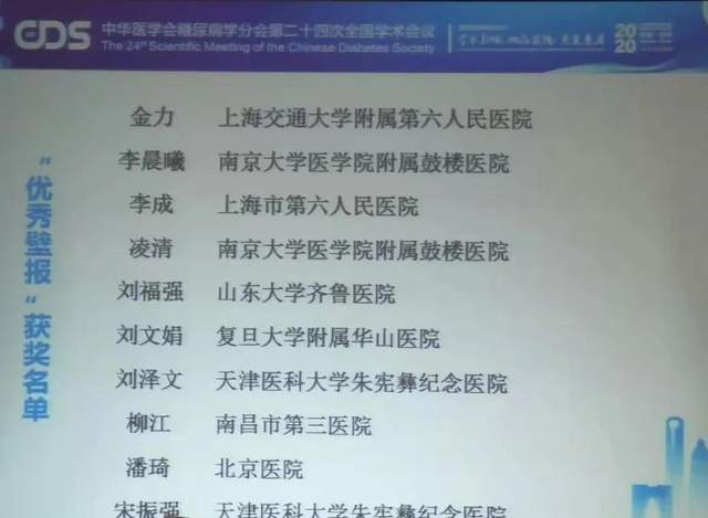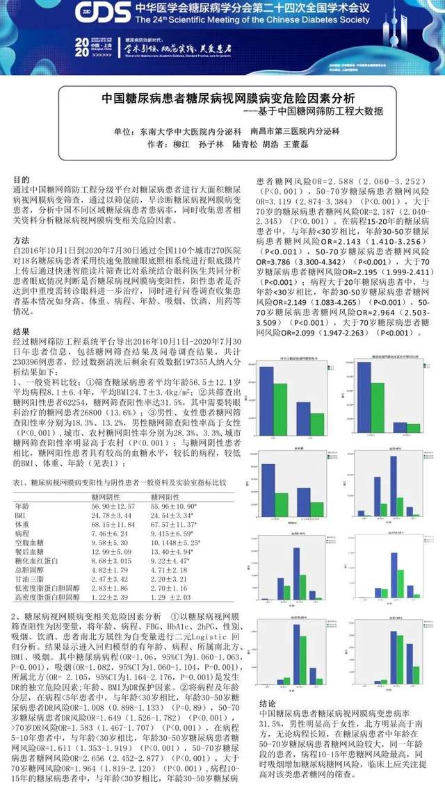 我院内分泌代谢科柳江博士投稿年会的壁报《中国糖尿病患者糖尿病视网膜病变危险因素分析——基于中国糖网筛防工程大数据》(指导老师:东南大学孙子林教授),经大会专家评定为2020年中华医学会糖尿病学分会优秀壁报,该研究结果来源于中国糖网筛防工程20万人群大数据分析,研究发现,中国糖尿病患者中糖尿病视网膜病变阳性筛查率高达31.5%,男性明显高于女性,北方明显高于南方,无论病程长短,在糖尿病患者中年龄在50-70岁糖尿病患者糖网风险较大,同一年龄段的患者,病程10-15年患糖网风险最高,同时吸烟明显增加糖尿病糖网风险,而戒烟可以减少糖尿病视网膜病变风险最终获益,临床上应关注提高对糖尿病患者糖尿病视网膜病变的筛查力度。
