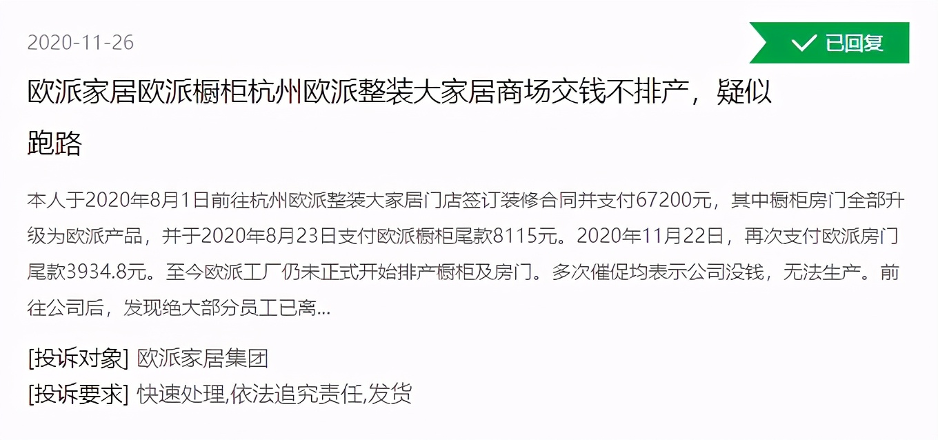 无独有偶,据《海峡都市报》报道,2019年7月,福州市长乐区鹤上镇红星美凯龙的欧派衣柜门店也被曝疑似“跑路”,事发时多位消费者仍未收到已经付费定制的家具产品。2020年8月,包头新闻网报道有消费者遭遇购买欧派卫浴产品超过一年后商家仍不发货的问题,经销商却表示“无钱退款”。