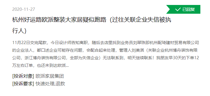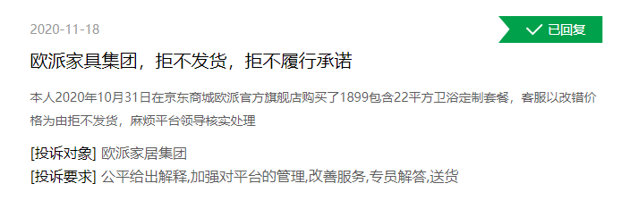 在聚投诉、黑猫投诉等平台,可以看到有多条针对欧派家居的消费投诉,主要涉及产品质量缺陷、未按约定时间发货和完工、经销商疑似“跑路”等问题。