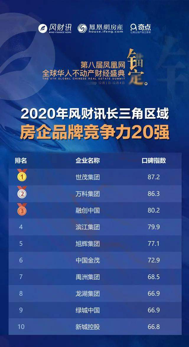 “锚定·第八届凤凰网全球华人不动产财经盛典”近日盛大落幕,300余位国内外重量级嘉宾跨洋对话,解读全球经济与不动产变局,世茂收获“十佳城市榜样企业”等奖项;此外,在盛典发布的“2020风财讯长三角区域房企品牌竞争力20强”榜单中,世茂于16项权威综合的参评指标下脱颖而出,以87.2分的口碑指数荣登TOP1。