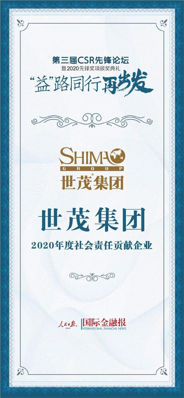 由人民日报社《国际金融报》主办的“‘益’路同行再出发-第三届CSR先锋论坛暨2020先锋奖项颁奖典礼”于近日圆满落幕,论坛对在抗疫援助、脱贫攻坚、公益事业等方面做出的突出贡献予以表彰,世茂荣获“2020年度社会责任贡献企业”大奖。