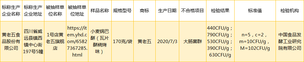 具体而言,1号店黄老五旗舰店(经营者为四川省内江市威远县黄老五食品股份有限公司)在1号店(网店)销售的、标称四川省内江市威远县黄老五食品股份有限公司制造的小麦锅巴酥(瓦片酥烧烤味)(规格型号:170g/袋;生产日期:2020-07-03),大肠菌群不符合食品安全国家标准规定。
