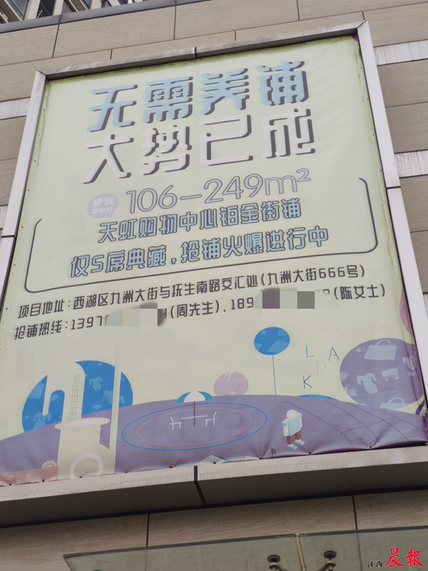 该片店铺的外墙上张贴着一块显眼的大型广告牌,上面写着“无需养铺,大势已成”8个大字,下方则介绍了天虹购物中心铂金街铺的销售情况。如今广告牌已明显褪色,但这样的广告词却深深刺痛着这群购买了店铺的业主。
