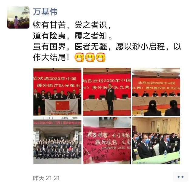 如今,孩子出生5个月尚在襁褓中,万基伟就要出征去非洲,工作和生活的双重压力可想而知,但他说:“物有甘苦,尝之者识;道有险夷,履之者知。虽有国界,医者无疆,愿以渺小启程,以伟大结尾。”
