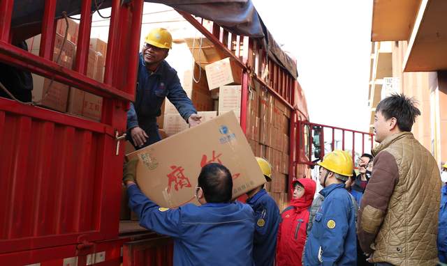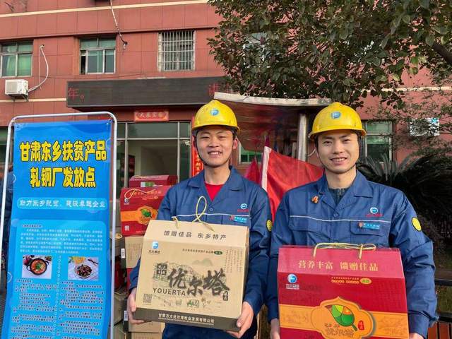 12月29日晚,满载羊肉、腐竹和粉条的5部大卡车从遥远的甘肃省临夏州东乡族自治县扶贫企业风尘仆仆全部运抵方大特钢。第二天一早,等候在各个发放点的工作人员有序地卸车、搬运,一排排整齐码放的扶贫产品格外喜庆。