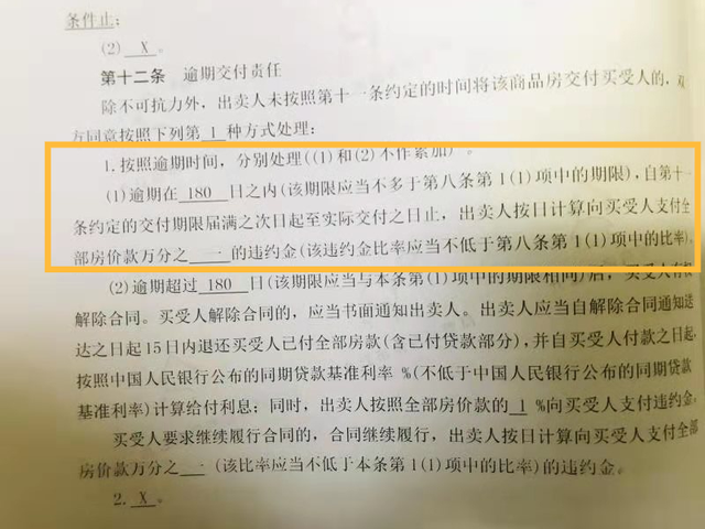 此外,根据合同第8条第1项第1款表明:“逾期180日之内,买受人按日计算向出卖人支付逾期应付款万分之一的违约金。”李先生表示,原本6月30日前要交屋的日期,因为疫情的关系,最多延后两个月(8月31号),然而交屋通知到9月底,后又延到11月12号,才陆续交房,这也明显与合同约定时间不符。