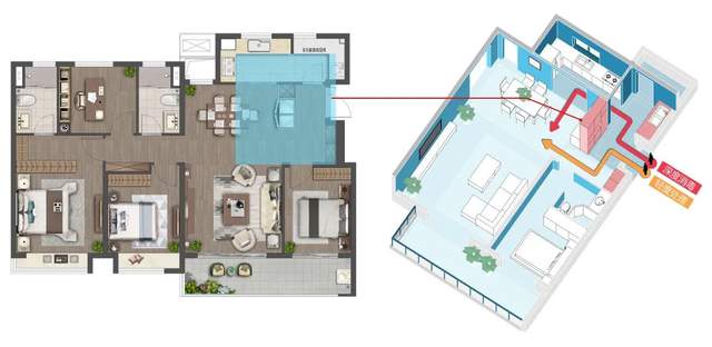 在「抗疫新品」设计理念的落地中,南京世茂璀璨睿湾项目的部分户型打造,设置两条入户流线。短时间出门的情况下,可以由“轻度处理”流线简单消毒、收纳外套后,步入客厅;若长时间进行过户外活动回家,则由“深度消毒”流线,流水洗手、外衣直接放在阳台晾晒,有效避免外部细菌进入客厅卧室等区域。
