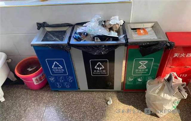 青山湖区京东镇政府大楼:分类垃圾桶中空荡荡 普通垃圾桶中满当当