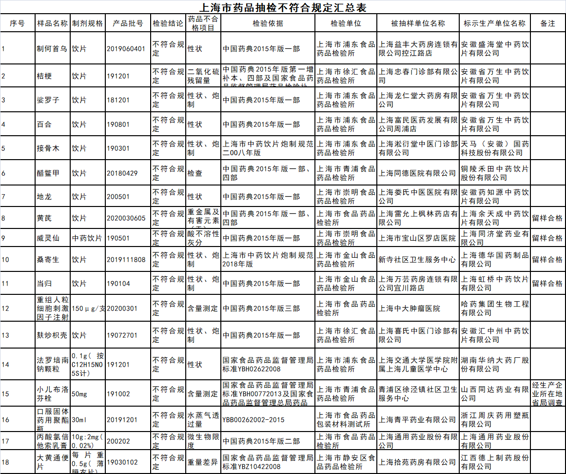 1月4日,上海市药品监督管理局发布的《2020年第4期药品质量抽检通告》显示,制何首乌、黄芪、重组人粒细胞刺激因子注射液、小儿布洛芬栓、丙酸氯倍他索乳膏、大黄通便片等18批次药品不合格,涉及安徽盛海堂中药饮片有限公司、安徽省万生中药饮片有限公司、上海通用药业股份有限公司、天马(安徽)国药科技股份有限公司、上海同济堂药业有限公司、哈药集团生物工程有限公司、湖南华纳大药厂股份有限公司、上海通用药业股份有限公司等十余家生产企业。
