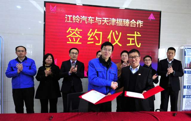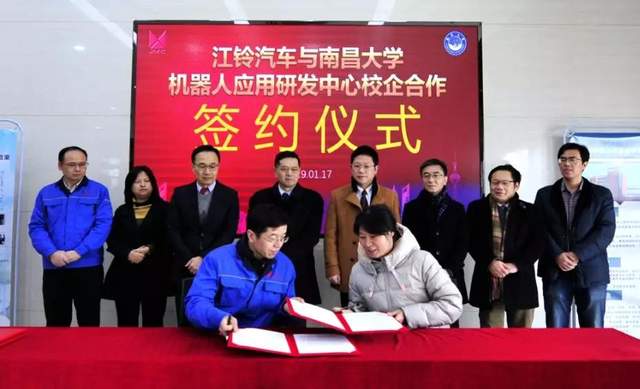 项目签约仪式上,江铃股份与南昌大学签订机器人应用研发中心校企合作协议,与天津福臻工业装备有限公司签订合作意向。