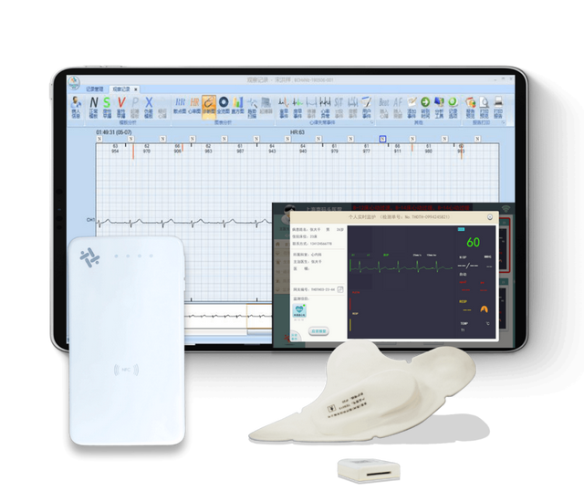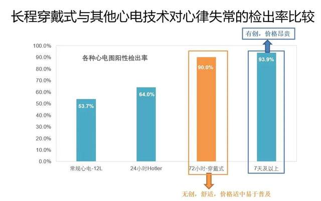 (2)72小时持续监测,提高了阳性检出率,单导联长程心电的诊断准确率已达到90%,而传统的24小时Holter准确率只有64%;