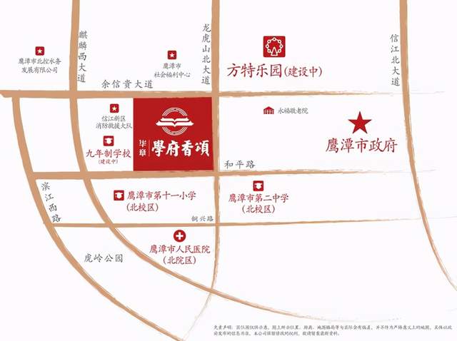 免责声明:1. 开发公司为“鹰潭华章金投文化发展有限公司”2. 本宣传资料为要约邀请,不作为要约或承诺;3. 本宣传资料相关宣传内容不排除因政府相关规划、规定及出卖人分期规划、未能控制等原因而发生变化;4. 本宣传资料的教育配套信息仅供参考。学校的名称、建成时间、开办学性质、办学规模、学位设置、开学时间、招生条件、收费标准及招生区域划定等均存在未确定或者调整的可能,出卖人对此不作任何承诺,须以政府教育主管部门及校方的最新政策为准;5. 本宣传资料对项目与周边环境、交通、公共设施的地理关系示意,并非地图,旨在协助提供相关信息,不意味着公司对此作出任何承诺;6.本宣传资料所发布的内容为2021年1月的信息,敬请留意最新资料;本文内容最终解释权归鹰潭华章金投文化发展有限公司所有。