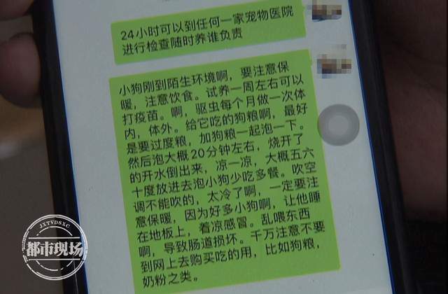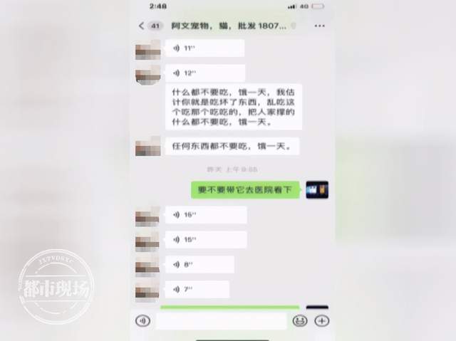 冯女士:然后我们就和店家联系,店家就说,叫我们静养24小时,就是不给狗任何吃的,把它关在笼子里静养。我们当时就说要不要到医院检查一下?他给我们的回复是,你钱多你就带它去。