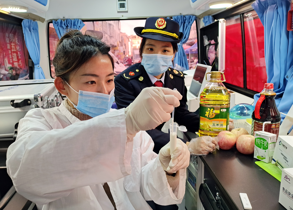 图为2月2日该局食品检测人员食品检测车内为消费者选送的蔬菜、肉类等食品进行快速检测。