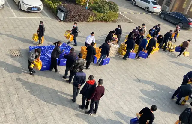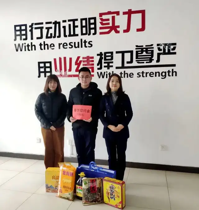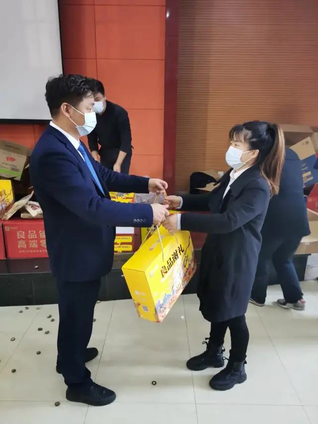 年货有江西特产板鸭、精选特产冬菇、鲁花压榨食用油、泰国大米、良品铺子坚果、青怡苹果等。各部门员工拿着满满的年货,大家脸上都洋溢着开心的笑容。