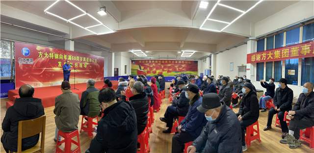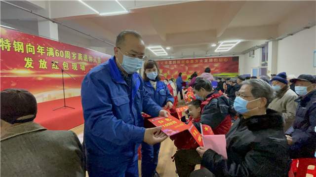 上午10时,喜庆欢快的音乐声中,红包发放仪式正式开始。方大特钢党委书记凌建安代表该公司致辞。2020年,面对突如其来的新冠肺炎疫情,在方大集团董事局方威主席的带领下,方大特钢全体干部员工战疫情、抓生产、用奋斗谱写了共克时艰的精彩华章。全年铁钢产量超额完成任务,企业效益稳步提升。良好成绩是方大特钢全体干部员工“哈下腰”干出来的结果,也离不开各位离退休人员的关心和支持。一直以来,方威主席从未忘记曾经为公司建设发展作出贡献的离退休人员,方大特钢给予离退休人员的捐赠金、孝敬父母金、方大养老金等福利一年比一年多。2011年5月至2021年1月,方大特钢累计发放捐赠金约4800万元;发放孝敬父母金约8600万元;发放红包金额约4600万元;发放方大养老金1.67万元。今年在新冠肺炎疫情形势下,又一次为离退休人员每人发放1000元红包,让各位老同志过个幸福快乐年,这充分体现了方威主席对离退休人员的关心关爱。