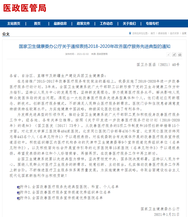 近日,国家卫健委办公厅通报表扬了2018-2020年改善医疗服务先进典型医院、科室、个人及宣传报道优秀医院。通报从改善医疗服务的5项工作制度和10项创新举措等15个方面,对全国484家医院、476个科室、443名个人及积极面向社会开展宣传引导的15家医院予以表扬。南昌市第三医院护理部在“以社会新需求为导向,延伸提供优质护理服务”举措方面被通报表扬。