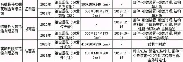 值得注意的是,有3家企业连续两次抽查不合格,分别是:江西省万载县强隆烟花制造有限公司、湖南省临澧县人参花炮有限公司、陕西省蒲城县铁实花炮有限公司。