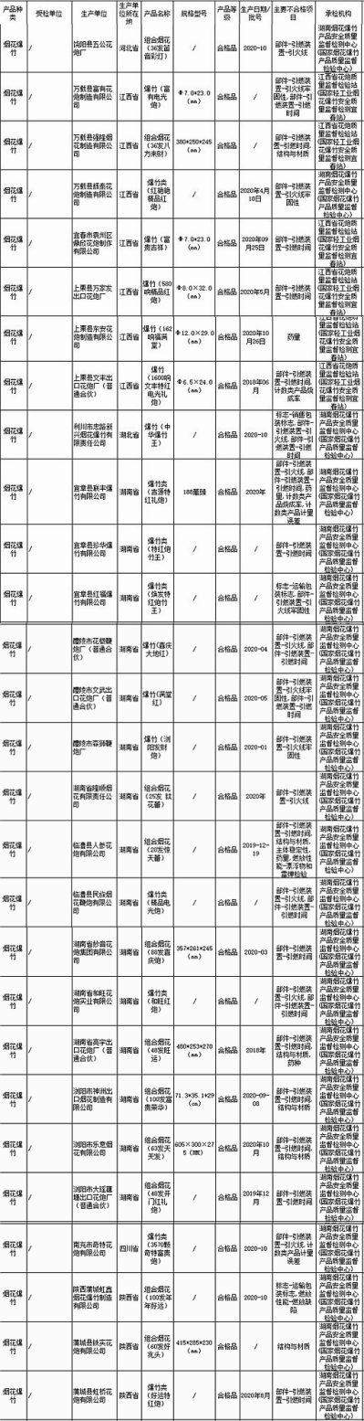 不合格产品涉及:江西省万载县富有花炮制造有限公司生产的爆竹(富有电光炮)、江西省万载县辉泰花炮制造有限公司生产的爆竹类(红艳艳精品红炮)、湖南省宜章县红福爆竹有限公司生产的爆竹类(焕发特红炮竹王)、湖南省醴陵市文武出口花炮厂(普通合伙)生产的爆竹(满堂红)、湖南省醴陵市森狮鞭炮厂生产的爆竹(浏阳发财炮)。