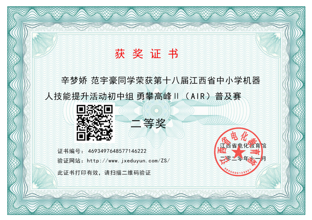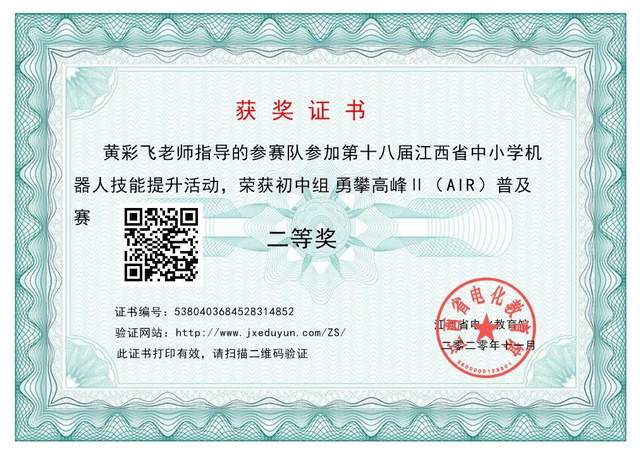 在第十八届江西省中小学智能机器人技能提升活动中,赣西外国语学校黄彩飞老师辅导的学生刘友星、张子滢、辛梦娇、范宇豪获得“勇攀高峰Ⅱ(AIR)普及赛”初中组省级二等奖。